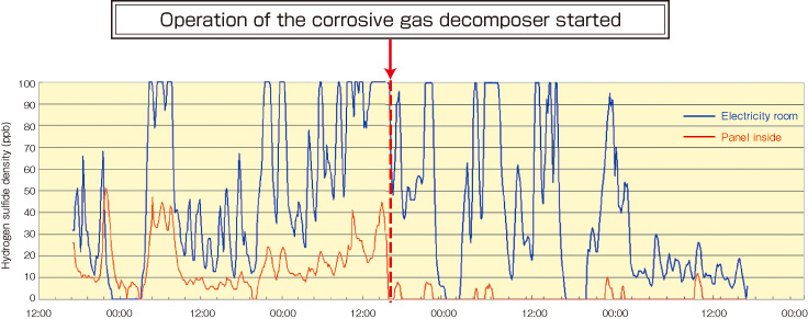 In the sludge concentration chamber of a certain waste water treatment plant, the concentration of hydrogen sulfide gas in switchgear was measured with and without operating the corrosive gas decomposer.