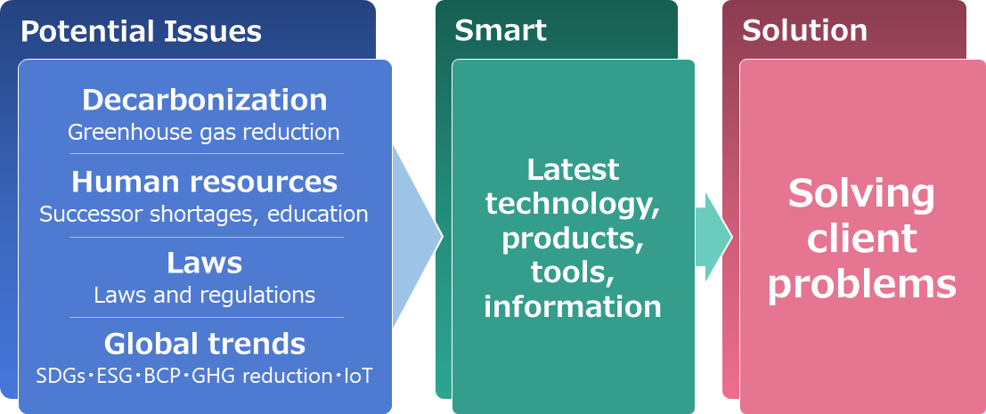 A problem-solving assistance service. Meiden Engineering helps ensure client business continuity by solving issues detected during walkthroughs. Our solutions are provided by combining the expertise we have acquired over the years as a maintenance provider with the latest technology, global trends and information.