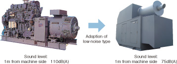 We respond to customer requests such as [We want to have an emergency power supply facility that is highly dependable even in the middle of earthquake disaster.], [We want to eliminate claims possibly arising in the case of noise and black fume during rutine inspection.], and [We want to use the generator room more efficiently.]