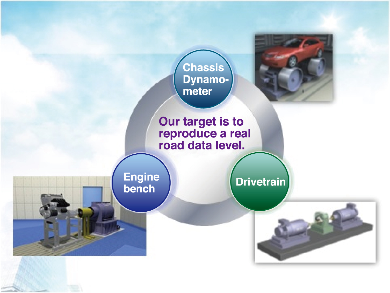 Our mission is to shorten the development period of vehicle. For the mission, we work to improve the recreation performance of the test system in order to get more realistic test data. If measurement accuracy of the testing system is bad, repeated testing will be needed to determine whether variation of data is caused by the testing system or the specimen. Various tests can be carried out with one system, thus equipment operating ratio is enhanced and total testing time is shortened.