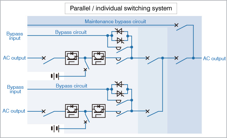 - Parallel system is configured by connecting multiple UPS which have built-in bypass switching circuit in parallel and has no common switching circuit.