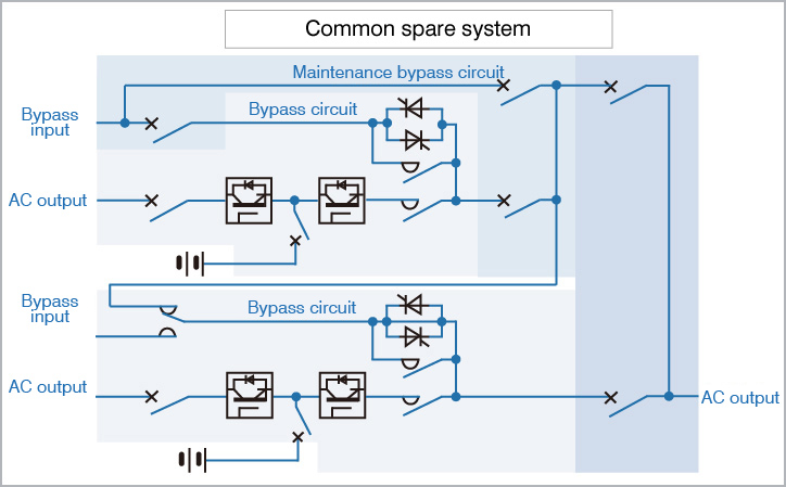 - During UPS inspection, power supply is continued to the load by the maintenance bypass circuit.