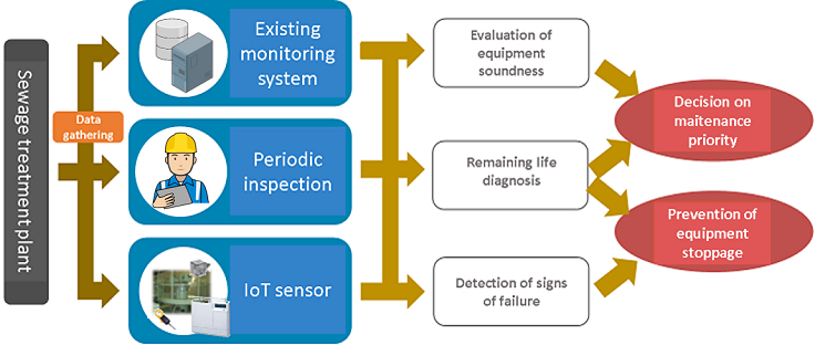 As stable operation is demanded of social infrastructure such as sewage treatment facilities, appropriate maintenance is required at the appropriate timing for equipment as it deteriorates over the years of operation. On the other hand, how to best make maintenance more efficient has become an issue in light of issues such as drop in tax revenues and passing on of equipment operation skills being difficult with the falling population. Meidensha utilizes IoT and ICT to overcome those issues, thereby supporting stable operation of equipment by identifying signs of equipment failure at an early stage, and we are going forward with efforts to make equipment maintenance more efficient by using objective evaluation of equipment soundness.