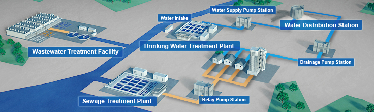 Drawing on our past experiences of building and developing the drinking water and sewage treatment plant projects across Japan, we provide customers with total support as "a supplier of comprehensive water treatment system". It can cover not only designing, manufacturing, and construction of water treatment plants but also its operation and facility management.