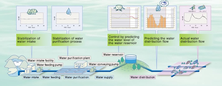 - Based on the predicted water supply demand volume, it stabilizes peak demand wave by using the buffer effect of the water reservoir. By stabilizing the every process of water intake, water feeding, water purification and water supply, it can produce the peak-shaving of energy and the power consumption.