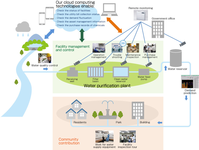Water utilities in Japan face various issues such as "better management (profit)", “passing on the skills and know-hows to younger generations” , etc. to ensure sustainable supply of safe and clean water. Under service agreement with the local government, we promise the local government (owner of water utility) and the local serving community that we will provide the "safe" water in a "stable" and "sustainable" manner through our water services including the water facility management. For these services, we drew on more than 120 years of experiences in the social infrastructure building and our track records of building water treatment facilities (mostly electrical facilities) across Japan. In addition, after the deregulation, our company became a first private-sector company in Japan to provide private water service under private public partnership agreement.
