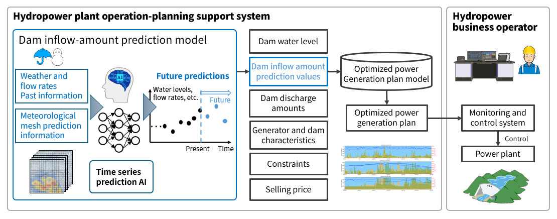 This system utilizes AI technology to predict future weather and flowrate changes based on time series data and improve hydropower plant operating efficiency. The AI learns about relationships between weather information and dam inflow amounts and, achieving a shift from operations reliant on past operating experience to data-based, optimized power generation plans.