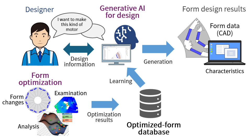 By combining form-optimization technologies and generative AI, it is possible to automate and speed up motor design work. Generative AI taught with optimized design data can create and propose optimal motor forms in just a short time based on the designer’s specification requirements, thus revolutionizing the traditional design process which relies on trial and error.